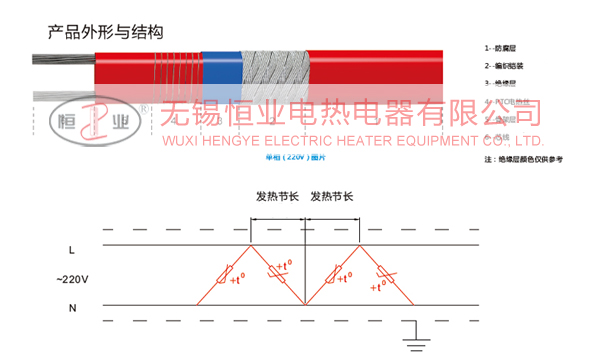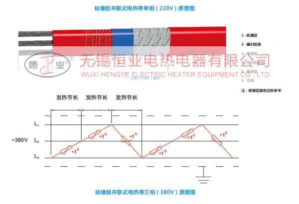 硅橡膠并聯(lián)式電熱帶的電源母線為二根或三根平行絕緣銅絞線, 在硅橡膠骨架層上纏繞P T C合金絲, 并將PTC合金電熱絲每隔一定距離相間交叉即“發(fā)熱節(jié)長"與母線連接,形成連續(xù)并聯(lián)電阻,母線通電后,各并聯(lián)電阻發(fā)熱,因而形成一條連續(xù)的電熱帶。硅橡膠并聯(lián)式電熱帶每米有一定標(biāo)稱功率,使用的電熱帶越長,輸出的總功率越大,但由于采用PTC合金絲作為發(fā)熱元件,因此,其本身具有隨溫度變化而調(diào)節(jié)輸出功率的特性,且電熱帶采用硅橡膠作為絕緣材料,因此,帶體柔軟,便于安裝。該電熱帶在現(xiàn)場能按實際需要長度任意剪切。